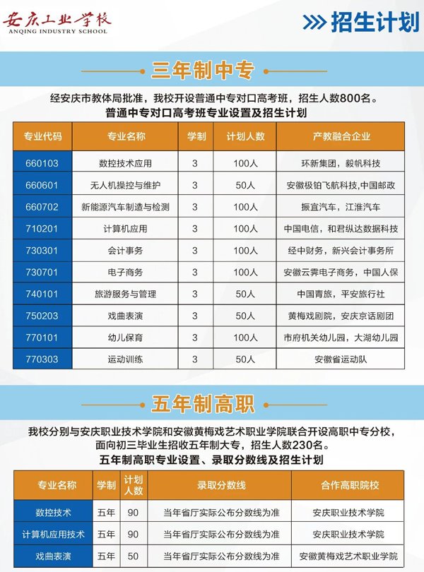 安庆工业学校是安徽省职业教育的先行者、安庆市中等职业教育的领军者。全校现设有六大类10个专业,现有47个教学班级,在校生达2300余人,学校稳居安庆市中职学校招生数第一,许多中考超过普高线的学生选择到我校就读。